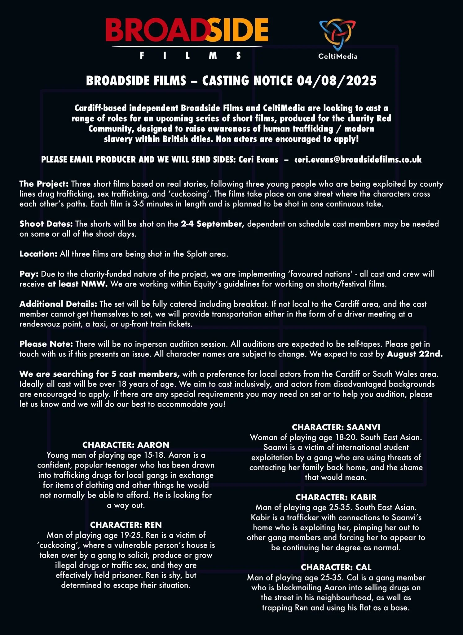 Broadside Films and 2V studios will be working together to create 3 powerful short films that will raise awareness about 3 forms of exploitation that are being faced by people in Wales today, namely county lines, cuckooing and the exploitation of international students and workers.
